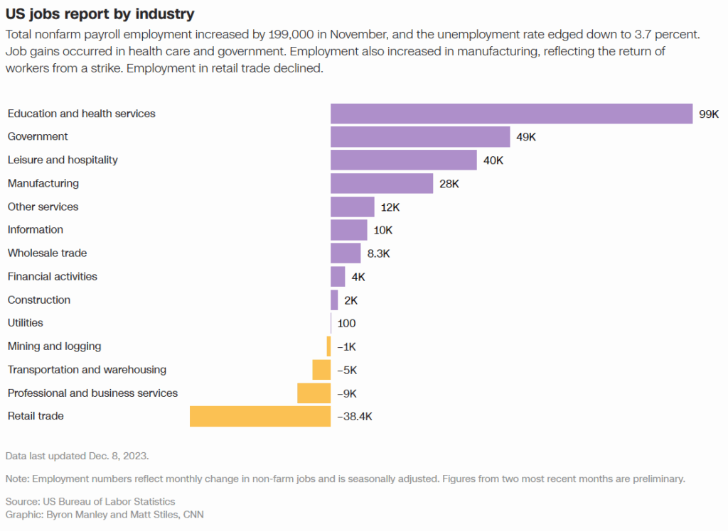 Employers added 199,000 jobs in November, and the unemployment rate dipped to 3.7% from 3.9% the month before, according to Bureau of Labor Statistics data released Friday.