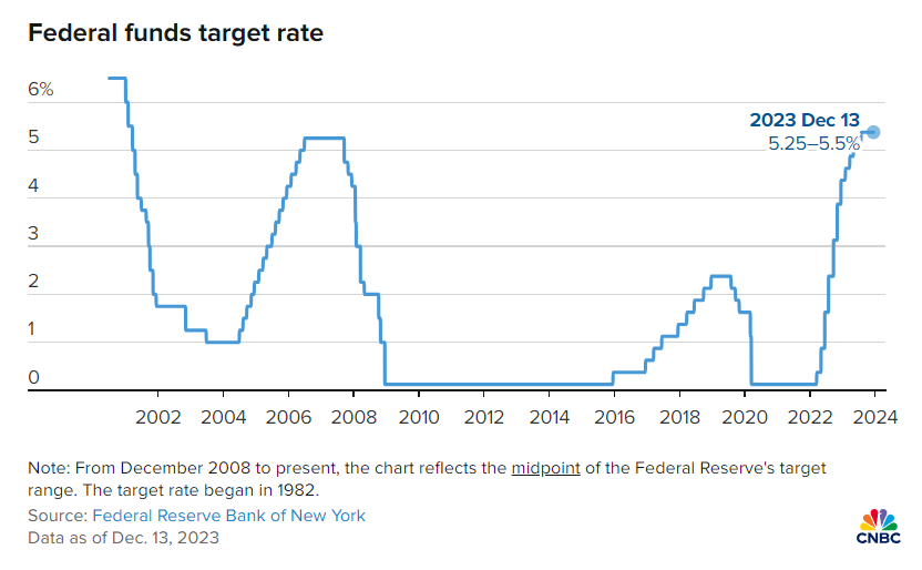 Markets had widely anticipated the decision to stay put, which could end a cycle that has seen 11 hikes, pushing the fed funds rate to its highest level in more than 22 years. There was uncertainty, though, about how ambitious the FOMC might be regarding policy easing. Following the release of the decision, the Dow Jones Industrial Average jumped more than 400 points, surpassing 37,000 for the first time.