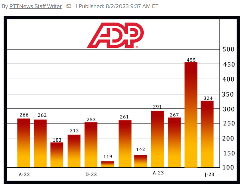 ADP said private sector employment shot up by 324,000 jobs in July after surging by a downwardly revised 455,000 jobs in June.