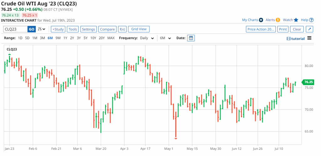 West Texas Intermediate Crude Oil Futures for September settlement which had a closing price of $75.66 on Tuesday ranged between a high of $76.23 and a low of $75.33. The current price of $76.05 represents a gain of 0.52 percent from the previous close.