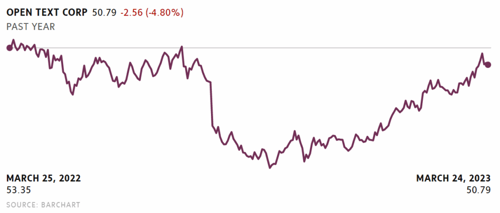 Waterloo, Ont.-based Open Text is a leading software and services provider of information management solutions. The company’s software helps its customers automate processes and manage supply chains.