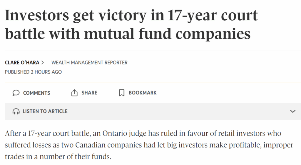 After a 17-year court battle, an Ontario judge has ruled in favour of retail investors who suffered losses as two Canadian companies had let big investors make profitable, improper trades in a number of their funds.
