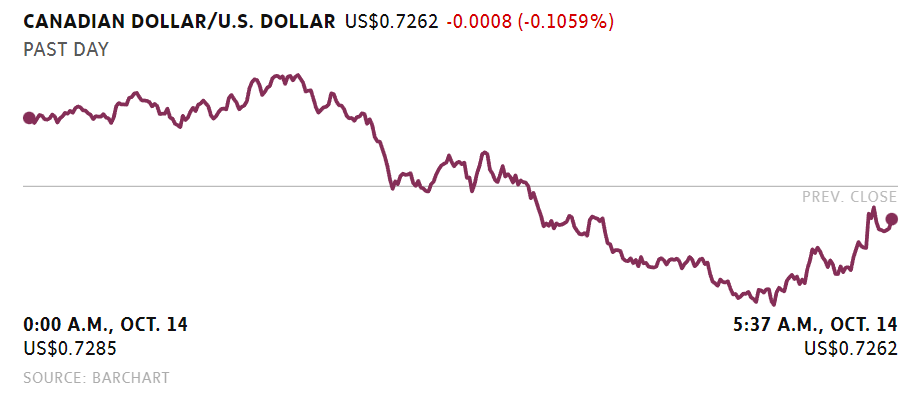 The day range on the loonie was 72.50 US cents to 72.97 US cents.