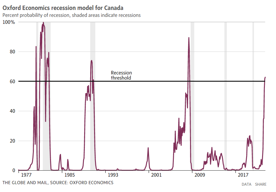 A Canadian recession model constructed by Oxford Economics shows the country’s economy has crossed a critical thresholdindicating a recession is “imminent,” with the firm’s director of Canada economics, Tony Stillo, warning in a report this week a moderate downturn will start in the next quarter and last until the middle of 2023