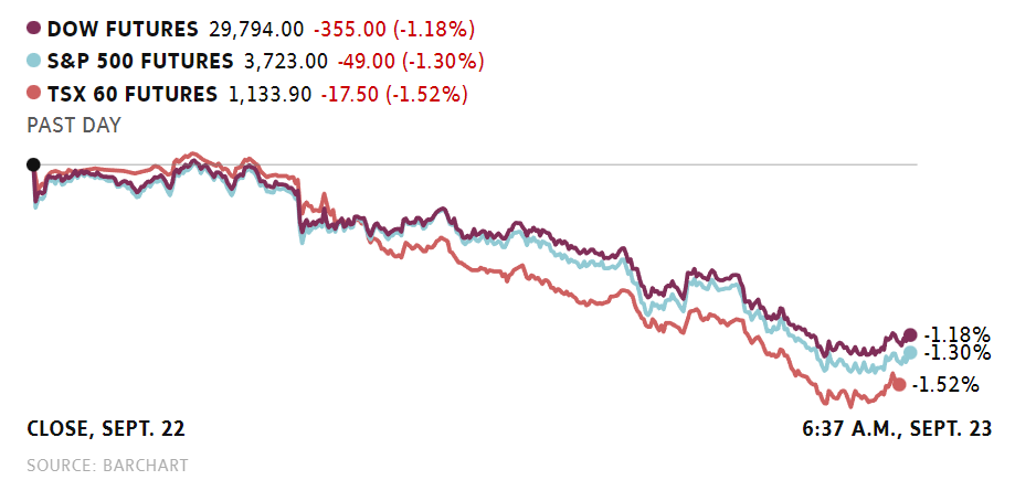 In the early premarket period, Dow, S&P and Nasdaq futures were all underwater. All three saw losses during a choppy session Thursday and are now on track for weekly declines. Heading into Friday’s session, the Dow is off more than 2 per cent for the week while the S&P and Nasdaq are both down more than 3 per cent. The S&P/TSX composite index ended down nearly 1 per cent on Thursday, its weakest closing level since July 26.