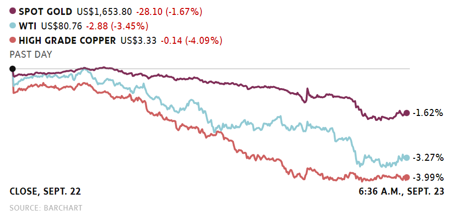 On Wall Street overnight, stocks fell for a third consecutive day over recession fears following the Fed’s latest 75-basis-point rate hike.