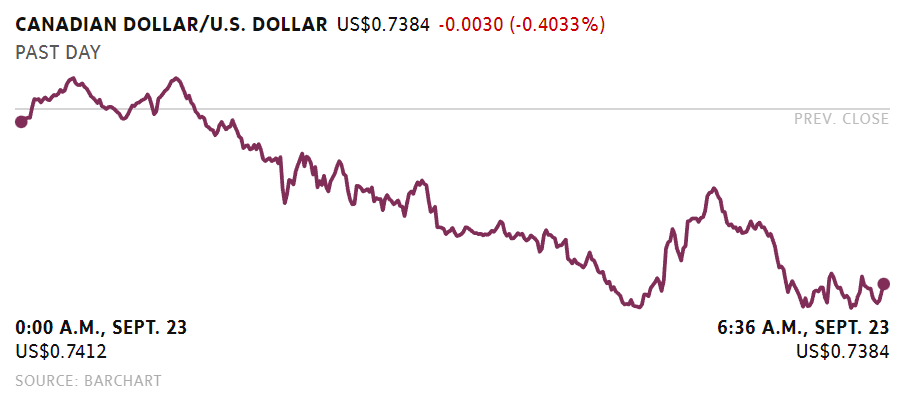 The day range on the loonie is 73.86 US cents to 74.26 US cents. On Thursday, the loonie hit its lowest level in two years against the U.S. dollar.