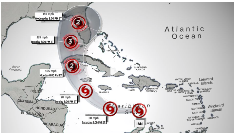 “Ian is likely to be near major hurricane intensity when it approaches western Cuba,” the hurricane center said. “Since Ian is not expected to remain over Cuba long, little weakening is expected due to that land interaction.”