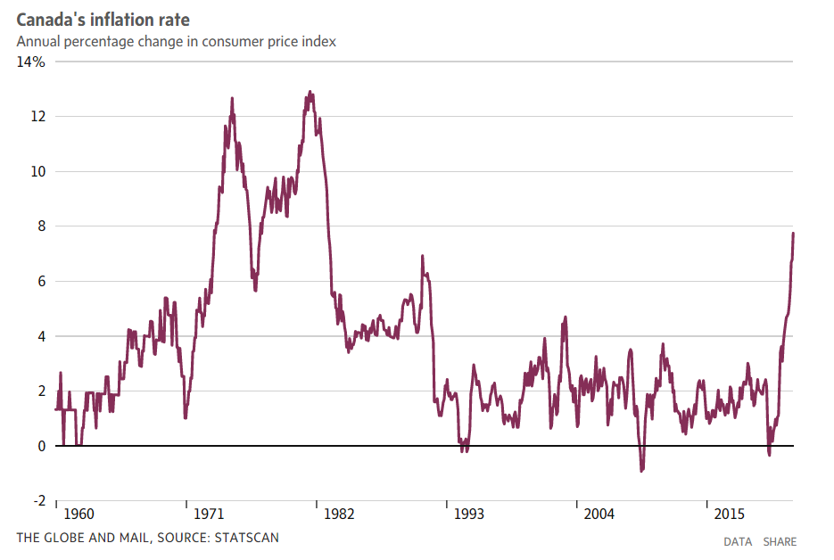 “Pressure on energy and food prices in particular will persist. But prices are rising across the board. Almost 60 per cent of the CPI basket is growing faster than the top end of the Bank of Canada’s 1-per-cent to 3-per-cent target range.”