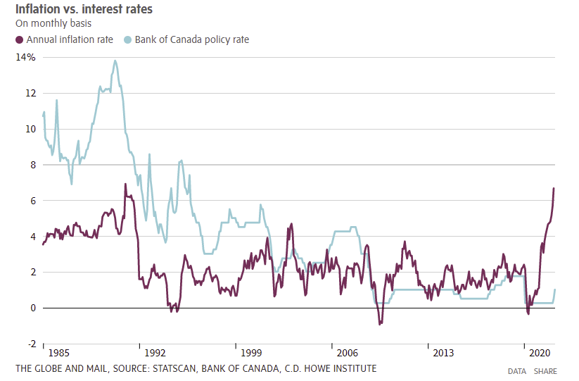Inflation has now exceeded the Bank of Canada’s target range of 1 per cent to 3 per cent for a full year, and that streak should last a while longer: The central bank expects inflation to average more than 5 per cent in 2022.