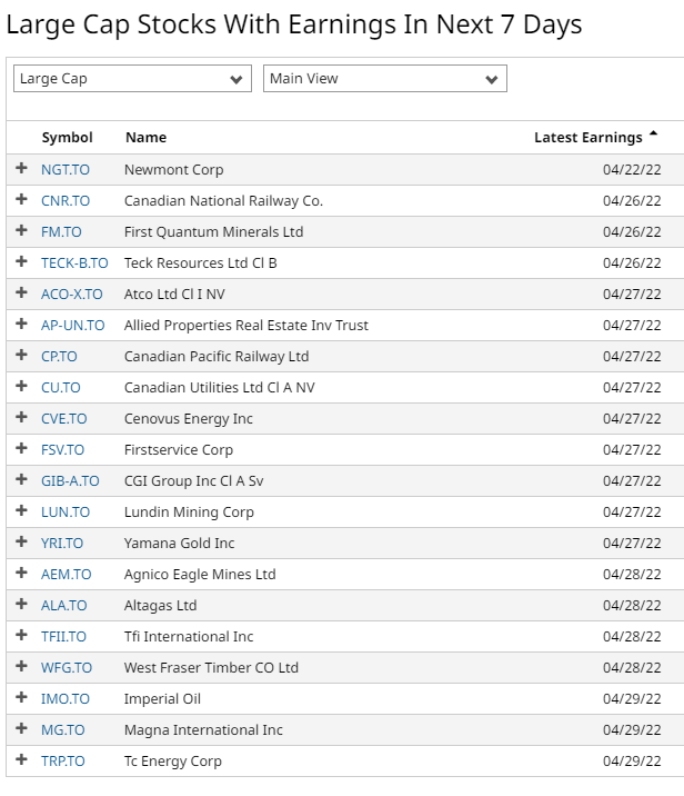Earnings include: Aecon Group Inc.; Alamos Gold Inc.; Allied Properties REIT; Alphabet Inc.; Atco Ltd.; Boeing Co.; Canadian Pacific Railway Ltd.; Canadian Utilities Ltd.; Cenovus Energy Inc.; CGI Inc.; Choice Properties REIT; FirstService Corp.; Lundin Mining Corp.; Meta Platforms Inc; Methanex Corp.; New Gold Inc.; Norfolk Southern Corp.; PayPal Holdings Inc.; Qualcomm Corp.; Teck Resources Ltd.; T-Mobile US Inc.; Yamana Gold Inc.
