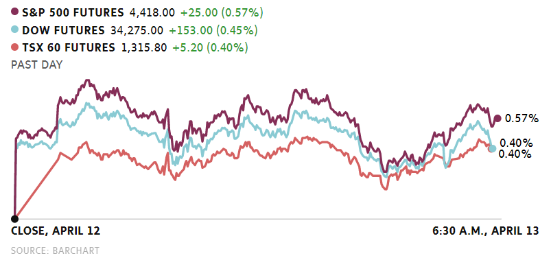 Wall Street futures edged higher early Wednesday as investors continued to weigh the latest U.S. inflation figures and brace for the start of earnings season. Major European markets were mixed with the latest policy decision from the European Central Bank due tomorrow. TSX futures futures were positive as crude prices advanced on the situation in Ukraine and investors await an expected rate hike from the Bank of Canada.