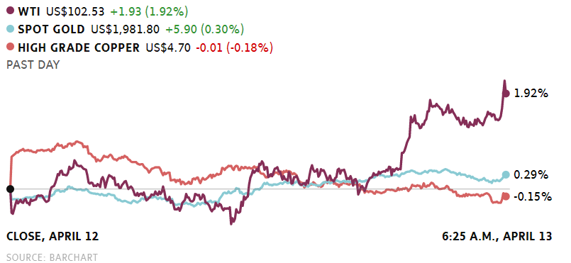 On Tuesday, Russian President Vladimir Putin blamed Ukraine for a deadlock in talks and said Russia had no option but to press on with its offensive. The comments added upside pressure to crude prices, again raising concerns over supply.