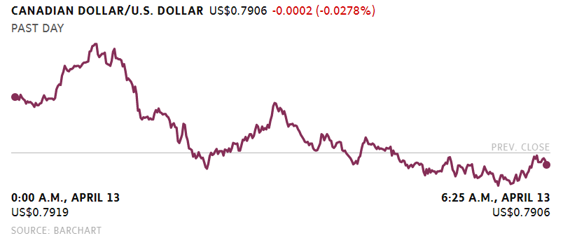The day range on the loonie is 79.05 US cents to 79.30 US cents.