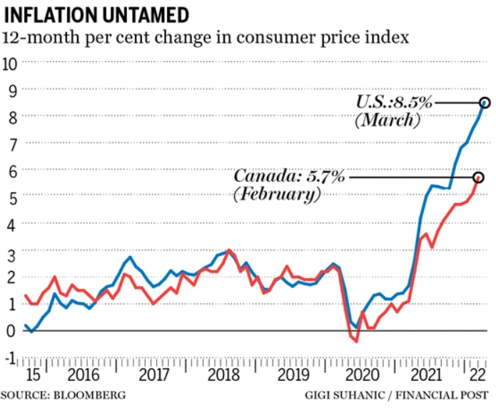The Bank of Canada said the war in Ukraine was the primary reason it underestimated inflation. Russia and Ukraine are big exporters of oil, natural gas, wheat and other commodities, and prices for those important inputs have soared since Russian President Vladimir Putin’s invasion of Ukraine on Feb. 24.