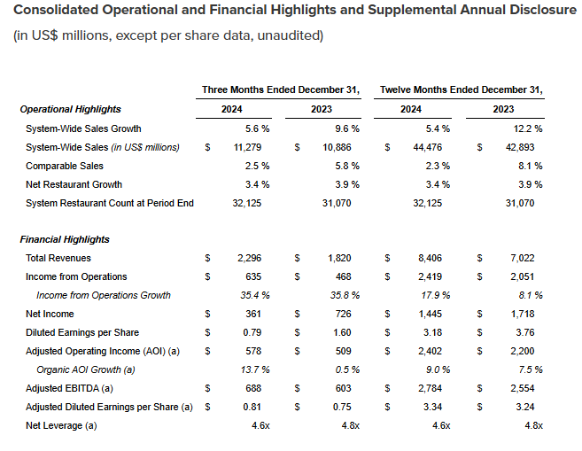 Restaurant Brands International Inc. Reports Full Year and Fourth Quarter 2024 Results