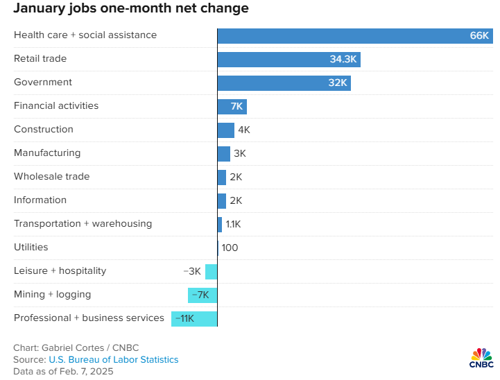 The gains in health care were broadly in line with the growth rates from 2024. The jump in retail jobs was more surprising, as that sector showed “little net change” last year, according to the bureau.