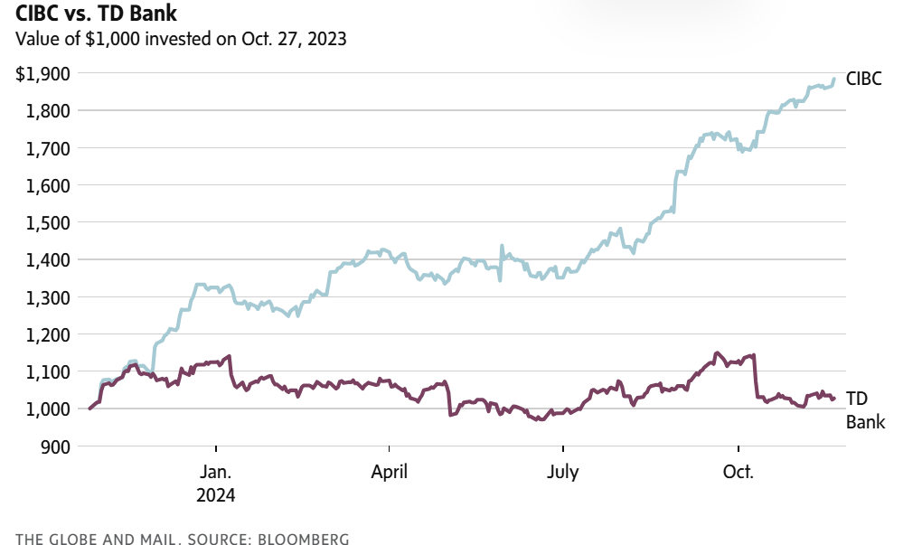Canadian Imperial Bank of Commerce CM-T -0.07%decrease sits comfortably at one end of the performance spectrum, with a gain of nearly 87 per cent (not including dividends) since October, 2023. At the other end, Toronto-Dominion Bank TD-T -0.89%decrease has gained just 2 per cent over this period, to Nov. 20.