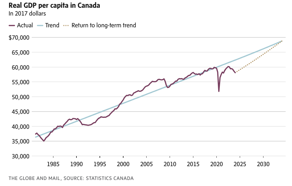Since 1981, real GDP per capita has risen by an average annual rate of 1.1 per cent, the Statscan report said. To return to the long-term trend by 2033, Canada will need to experience a decade of above-average growth.