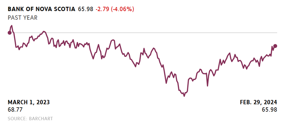 Still, it is one of only three Canadian big bank stocks in positive territory in 2024 – Canadian Imperial Bank of Commerce and top-performer National Bank of Canada (NA-T +0.74%increase) being the other ones. It is well ahead of Bank of Montreal (BMO-T +0.19%increase), Toronto-Dominion Bank (TD-T -0.22%decrease) and Royal Bank of Canada (RY-T +0.11%increase), which have slumped 6.8 per cent, 5.3 per cent and 2 per cent, respectively, this year.